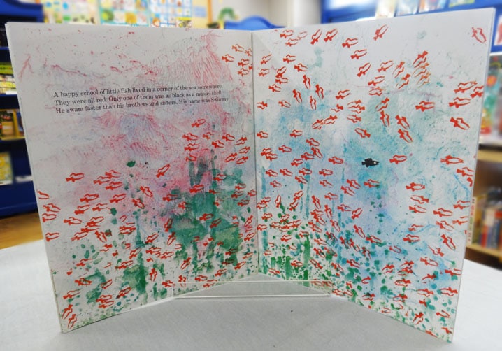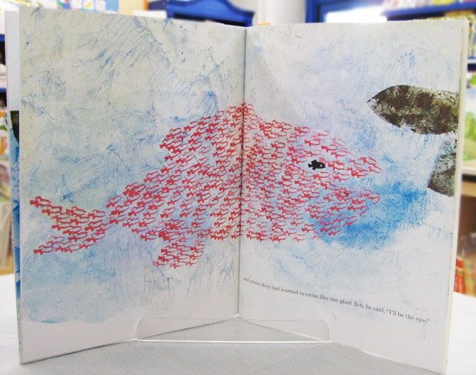 たった一匹で生き残った小魚のスイミーは、大きな魚に対抗するため、みんなで力を合わせることを思いつき、実行にうつします。