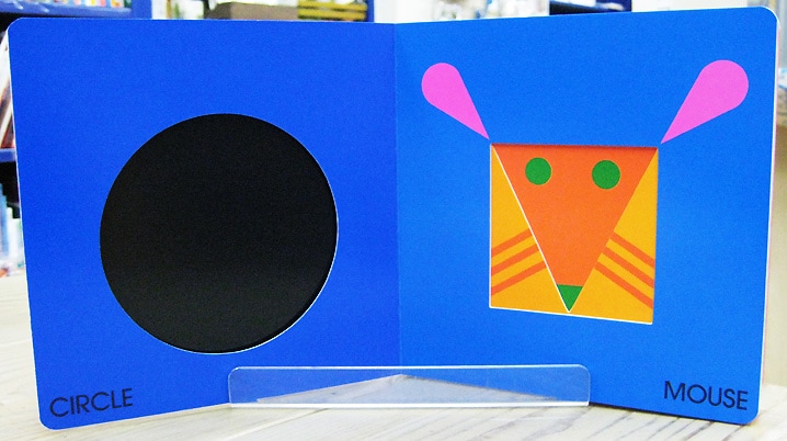 次ページが見える穴あきしかけつきで、三角や四角、まるなどの形の組み合わせによってページをめくるごとに次々と動物が現れるしかけ。
