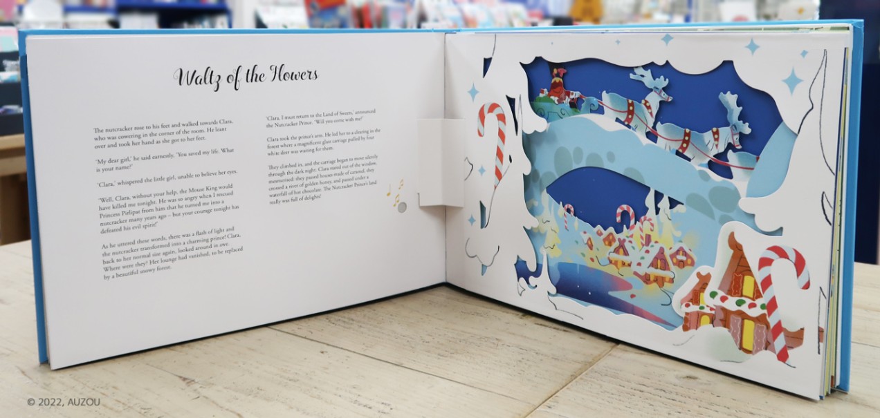 クリスマスの物語として有名な『くるみ割り人形』が、ページをめくると音楽が流れる、サウンドつきしかけ絵本になりました。