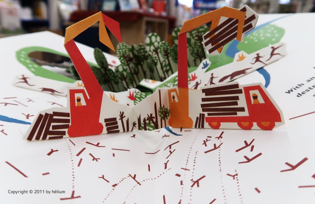 パッと目を引く、モスグリーンの鮮やかでさわやかな表紙に、お部屋に飾ってもステキなインテリアになりそうなデザインと、環境保護に対するメッセージが調和した、新しいしかけ絵本。