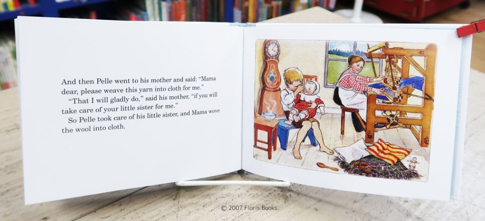自分が世話をしているヒツジの毛を刈り、おばあさんに紡いでもらう代わりに仕事をお手伝い、自分でお気に入りの青い色に染め、仕立て屋さんに持って行き、ここでも仕事をお手伝いして洋服に仕立ててもらい...。